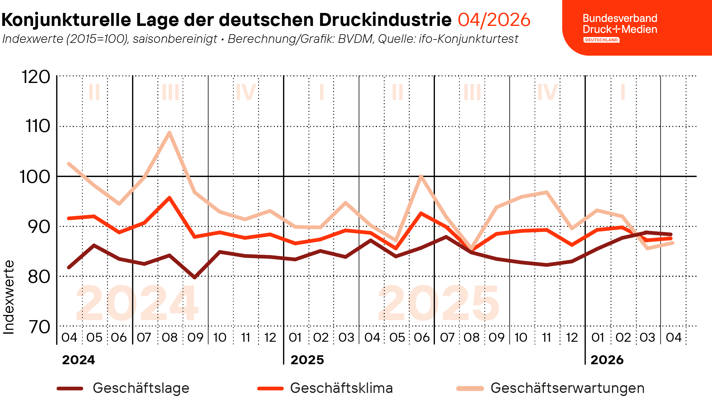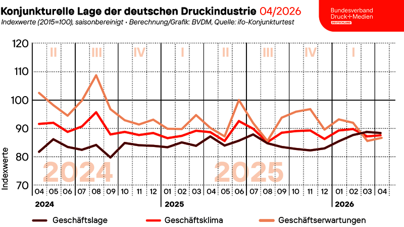 Im April 2026 verbesserte sich das saisonbereinigte Geschäftsklima in der deutschen Druck- und Medienindustrie wieder. Der vom Bundesverband Druck und Medien e. V. ermittelte saisonbereinigte Geschäftsklimaindex wies gegenüber dem Vormonat einen Zuwachs von 0,4 Prozent auf. Mit 87,8 Punkten lag der Index dennoch im April rund 1,2 Prozent unter dem Niveau des Vorjahresmonats. Während die aktuelle Geschäftslage von den Unternehmen leicht schlechter bewertet wurde als im März, verbesserten sich die Erwartungen für die kommenden sechs Monate leicht.