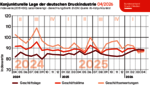 Die Geschäftserwartungen der Unternehmen der Druck- und Medienindustrie für die kommenden sechs Monate haben sich im April 2026 leicht verbessert. Der saisonbereinigte Index der Geschäftserwartungen stieg gegenüber dem Vormonat um 1,3 Prozent auf 86,9 Punkte. Damit liegt der Wert 3,8 Prozent unter dem Niveau des Vorjahresmonats. 3 Prozent der Unternehmen erwarten eine bessere Geschäftslage, 35 Prozent rechnen mit einer Eintrübung. 62 Prozent der Befragten gehen von einer gleichbleibenden Geschäftsentwicklung in den nächsten sechs Monaten aus. Der daraus resultierende saisonbereinigte Saldo verbesserte sich auf -32 Prozentpunkte, nachdem er im Vormonat noch -34 Prozentpunktebetragen hatte. Die Erwartungen an die Entwicklung der Verkaufspreise für die nächsten drei Monate zeigen auch ein deutliches Bild. 46 Prozent der befragten Unternehmen gehen von steigenden Preisen aus, 50 Prozent von gleichbleibenden und nur 4 Prozent von sinkenden Preisen.